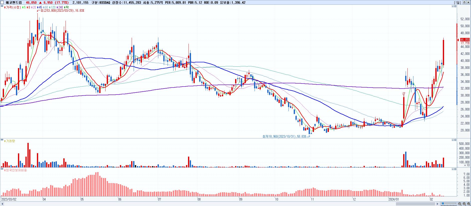 - 에코앤드림 (46,050원 ▲ 17.77% , 시총: 5,275억, 거래량: 2,103,753, 거래대금:925억)