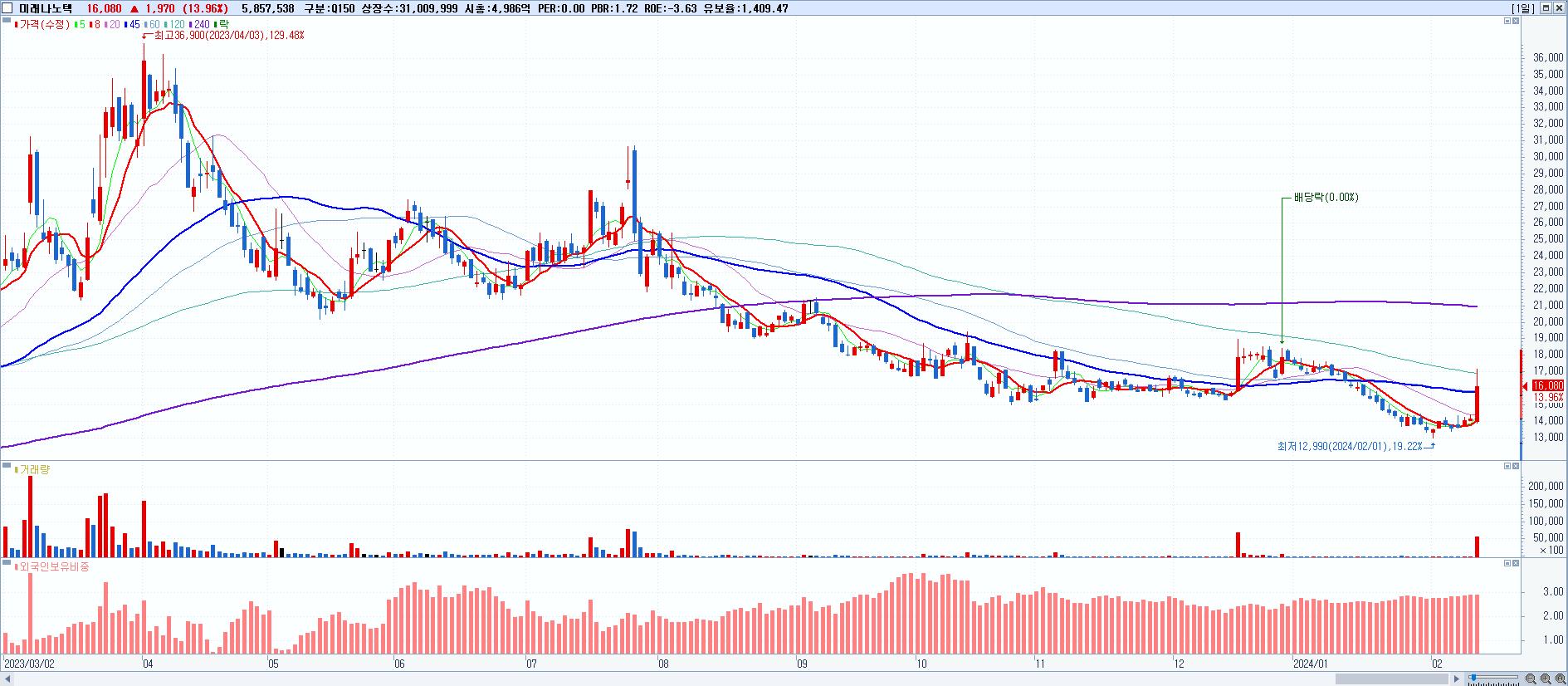 - 미래나노텍 (16,080원 ▲ 13.96% , 시총: 4,986억, 거래량: 5,864,431, 거래대금:960억)