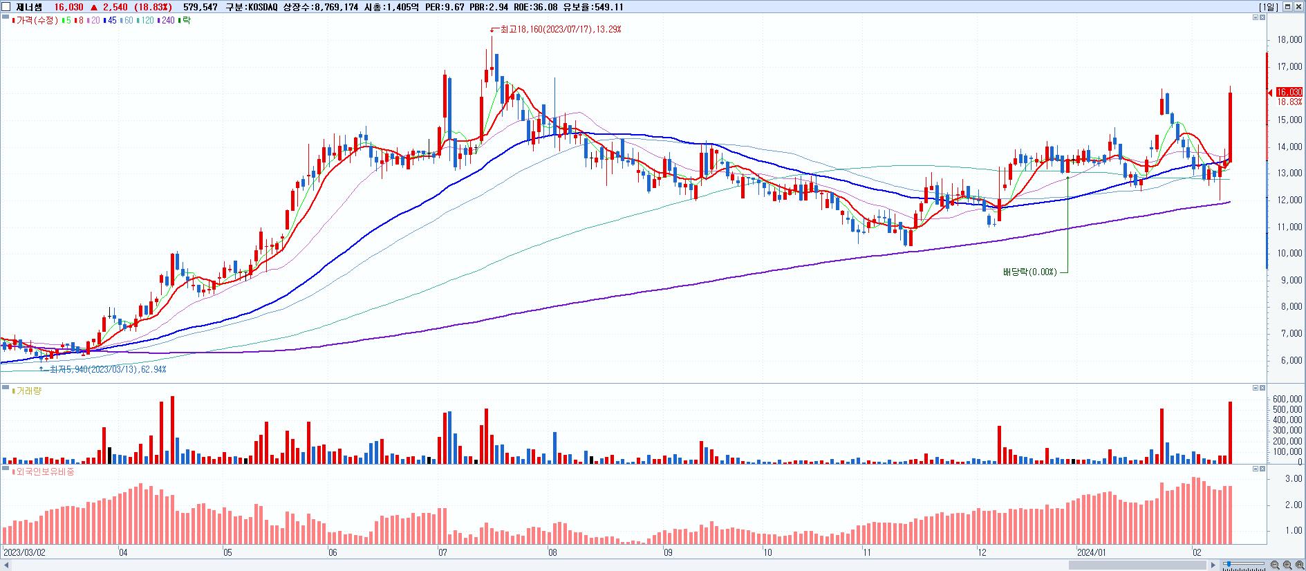 - 제너셈 (16,030원 ▲ 18.83% , 시총: 1,406억, 거래량: 580,325, 거래대금:89억)
