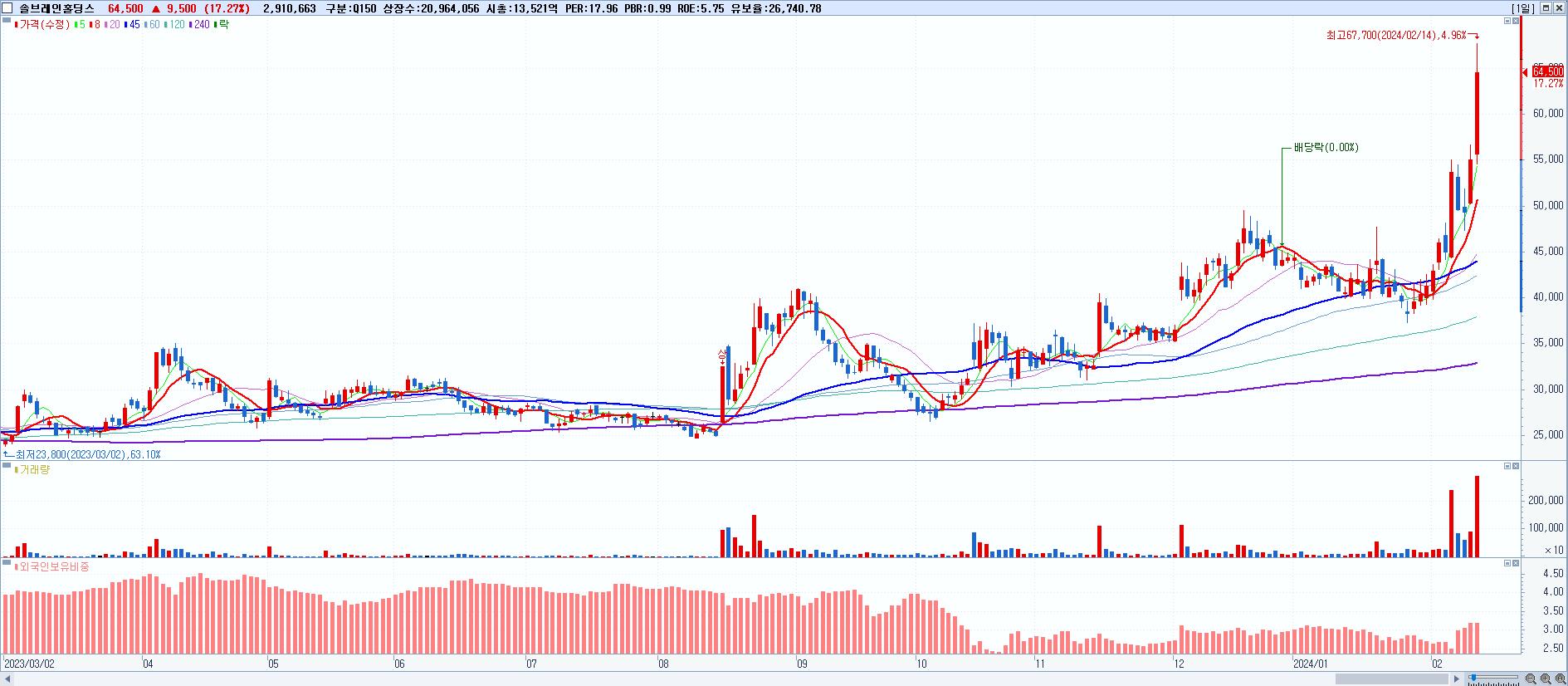 - 솔브레인홀딩스 (64,500원 ▲ 17.27% , 시총: 13,522억, 거래량: 2,915,633, 거래대금:1,836억)