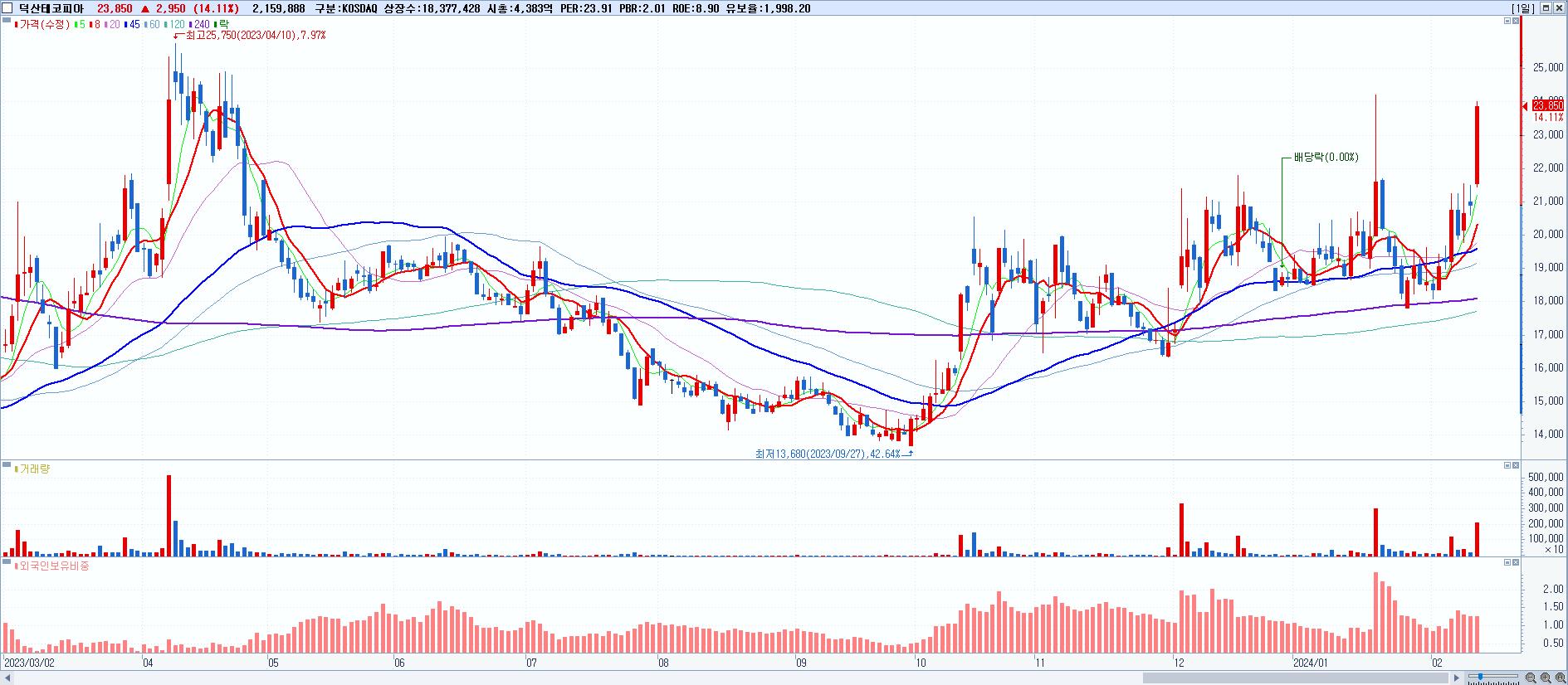 - 덕산테코피아 (23,850원 ▲ 14.11% , 시총: 4,383억, 거래량: 2,161,237, 거래대금:501억)