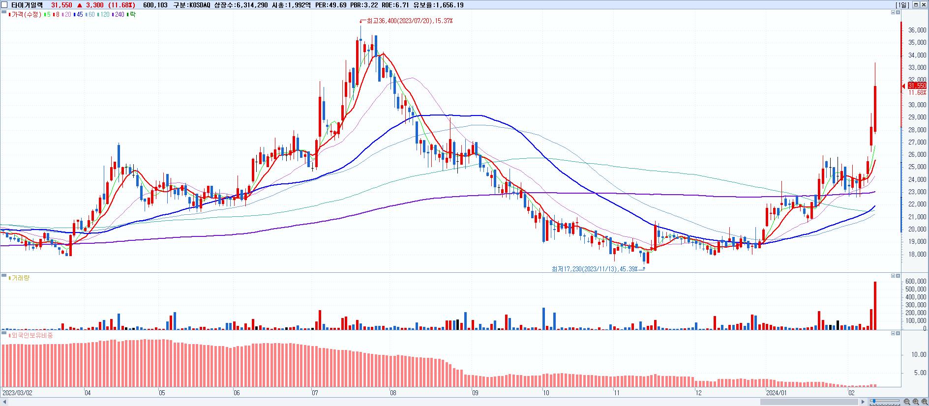 - 타이거일렉 (31,550원 ▲ 11.68% , 시총: 1,992억, 거래량: 600,165, 거래대금:186억)