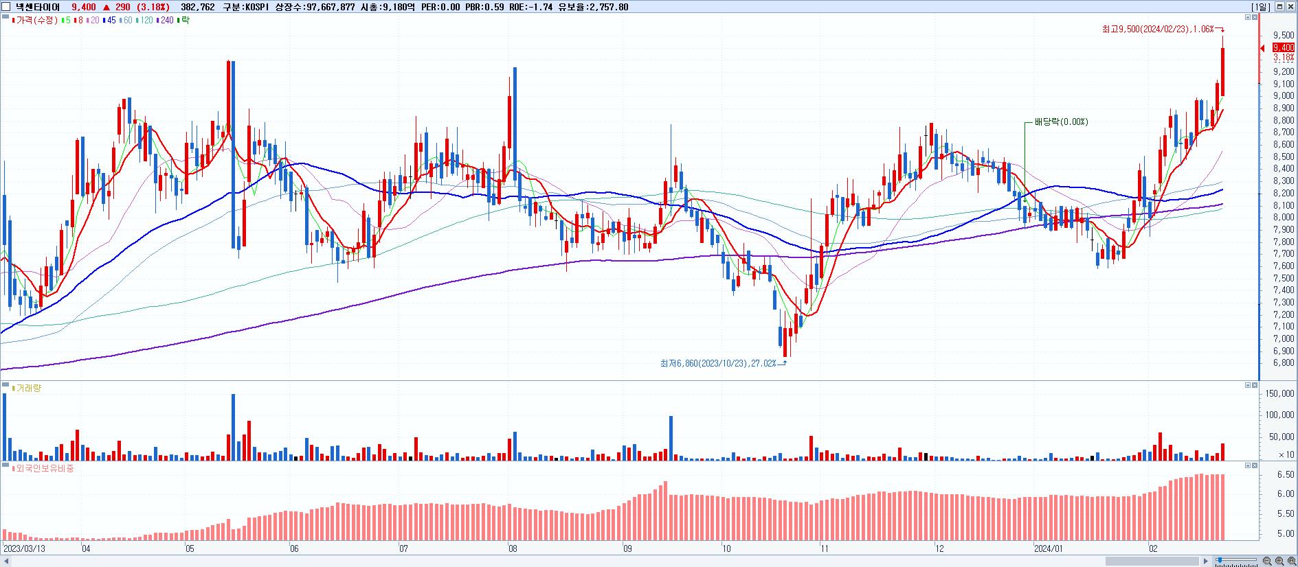 - 넥센타이어 (9,400원 ▲ 3.18% , 시총: 9,181억, 거래량: 383,201, 거래대금:36억, KOSPI)