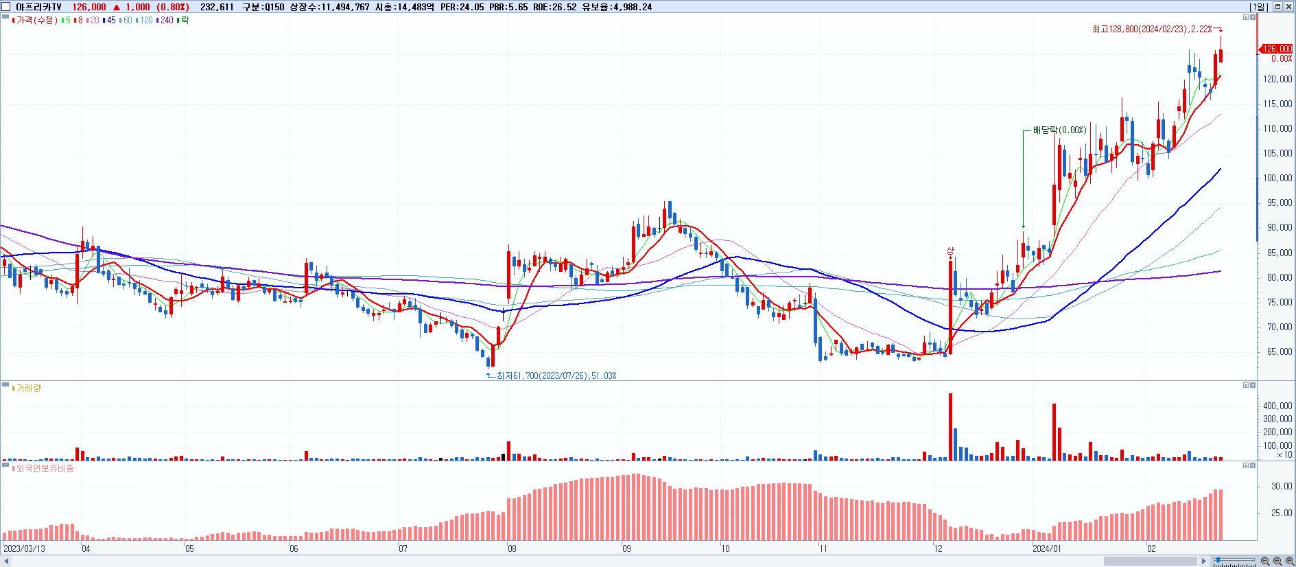 아프리카TV 126,000원 ▲ 0.8% (KOSDAQ, 067160)