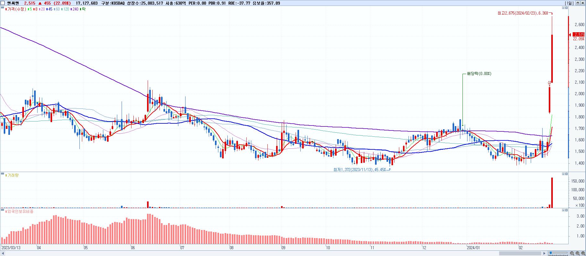 - 앤씨앤 (2,515원 ▲ 22.09% , 시총: 631억, 거래량: 17,160,940, 거래대금:421억, KOSDAQ)