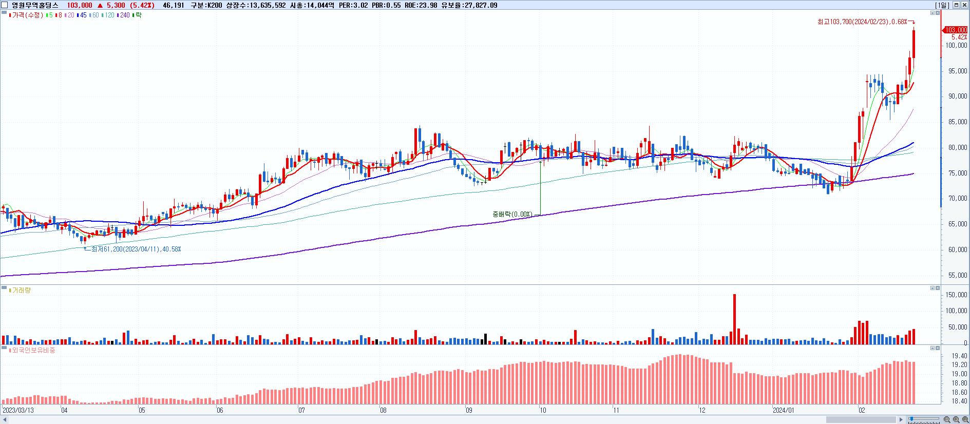 - 영원무역홀딩스 (103,000원 ▲ 5.42% , 시총: 14,045억, 거래량: 46,203, 거래대금:47억, KOSPI)
