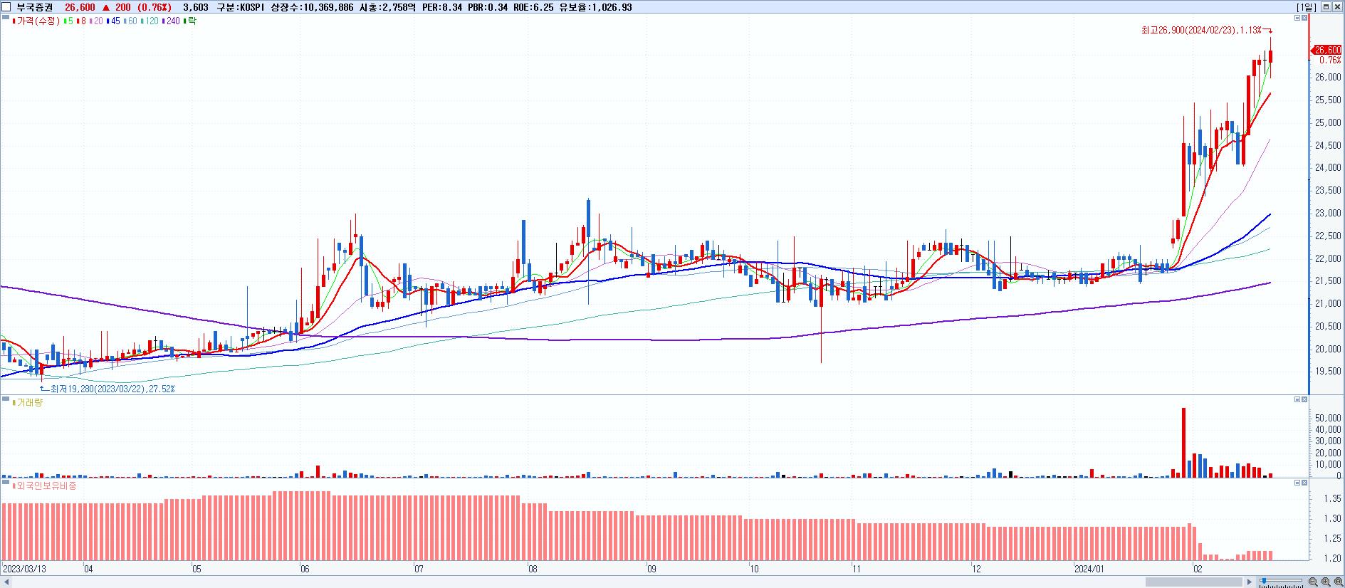 - 부국증권 (26,600원 ▲ 0.76% , 시총: 2,758억, 거래량: 3,603, 거래대금:1억, KOSPI)