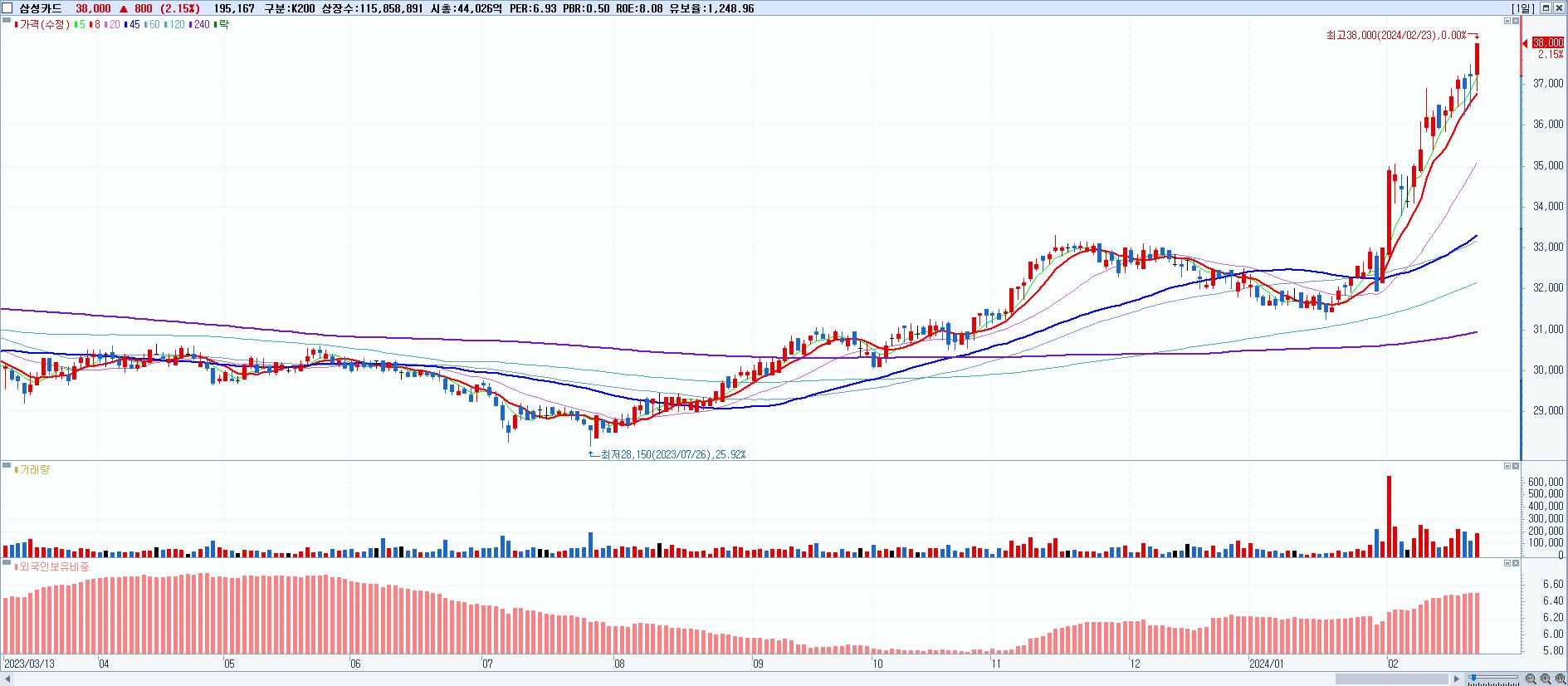 - 삼성카드 (38,000원 ▲ 2.15% , 시총: 44,026억, 거래량: 195,696, 거래대금:74억, KOSPI)