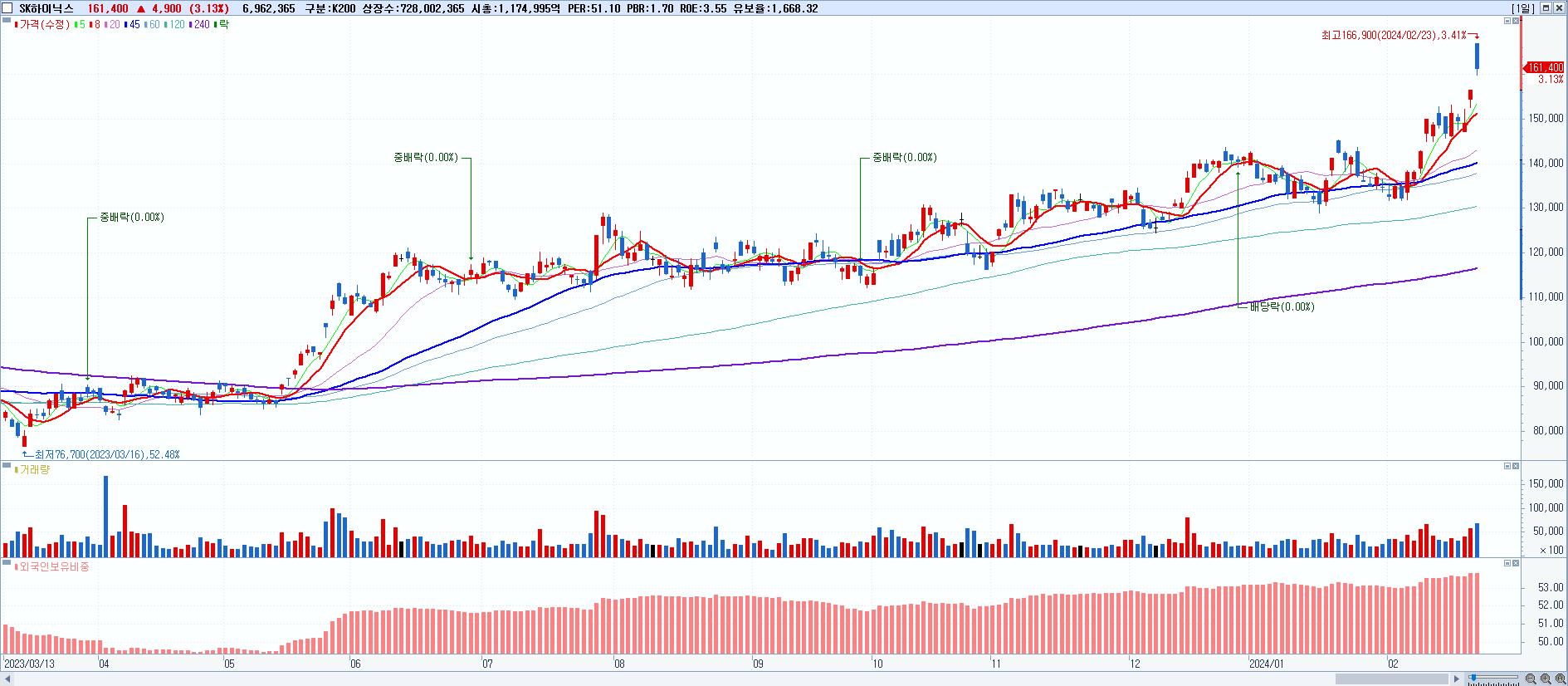 - SK하이닉스 (161,400원 ▲ 3.13% , 시총: 1,174,996억, 거래량: 7,001,363, 거래대금:11,410억, KOSPI)