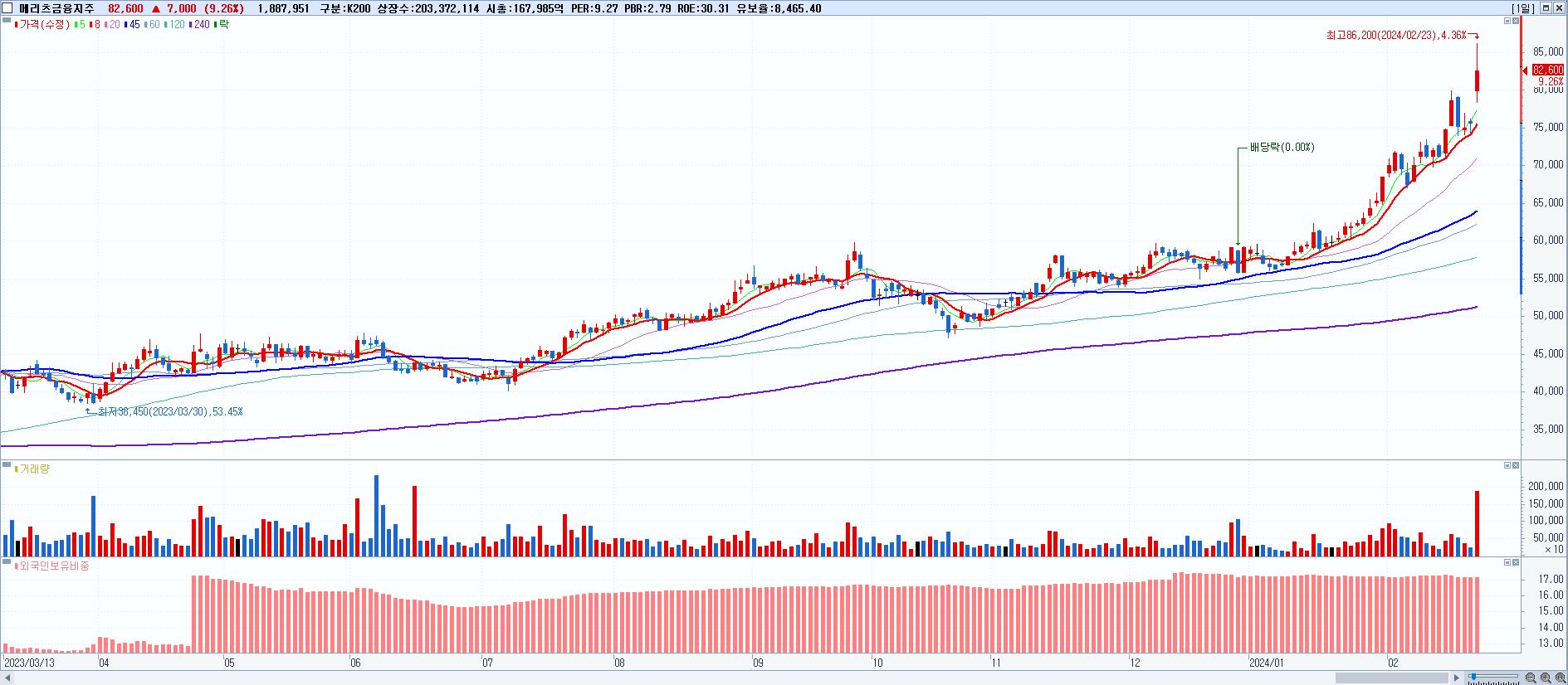 - 메리츠금융지주 (82,600원 ▲ 9.26% , 시총: 167,985억, 거래량: 1,889,111, 거래대금:1,566억, KOSPI)
