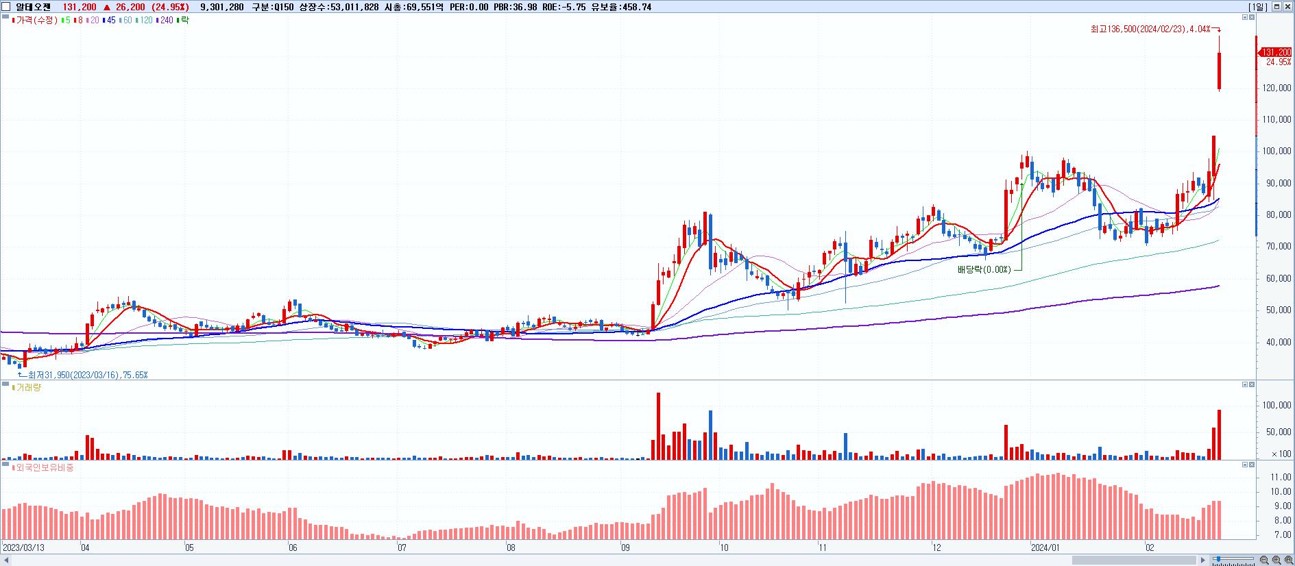 - 알테오젠 (131,200원 ▲ 24.95% , 시총: 69,552억, 거래량: 9,326,412, 거래대금:12,185억, KOSDAQ)