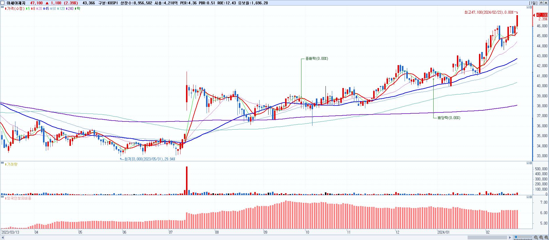 - 아세아제지 (47,100원 ▲ 2.39% , 시총: 4,219억, 거래량: 43,394, 거래대금:20억, KOSPI)