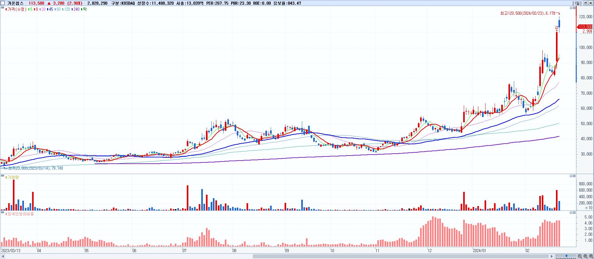 - 가온칩스 (113,500원 ▲ 2.9% , 시총: 13,039억, 거래량: 2,863,077, 거래대금:3,285억, KOSDAQ)