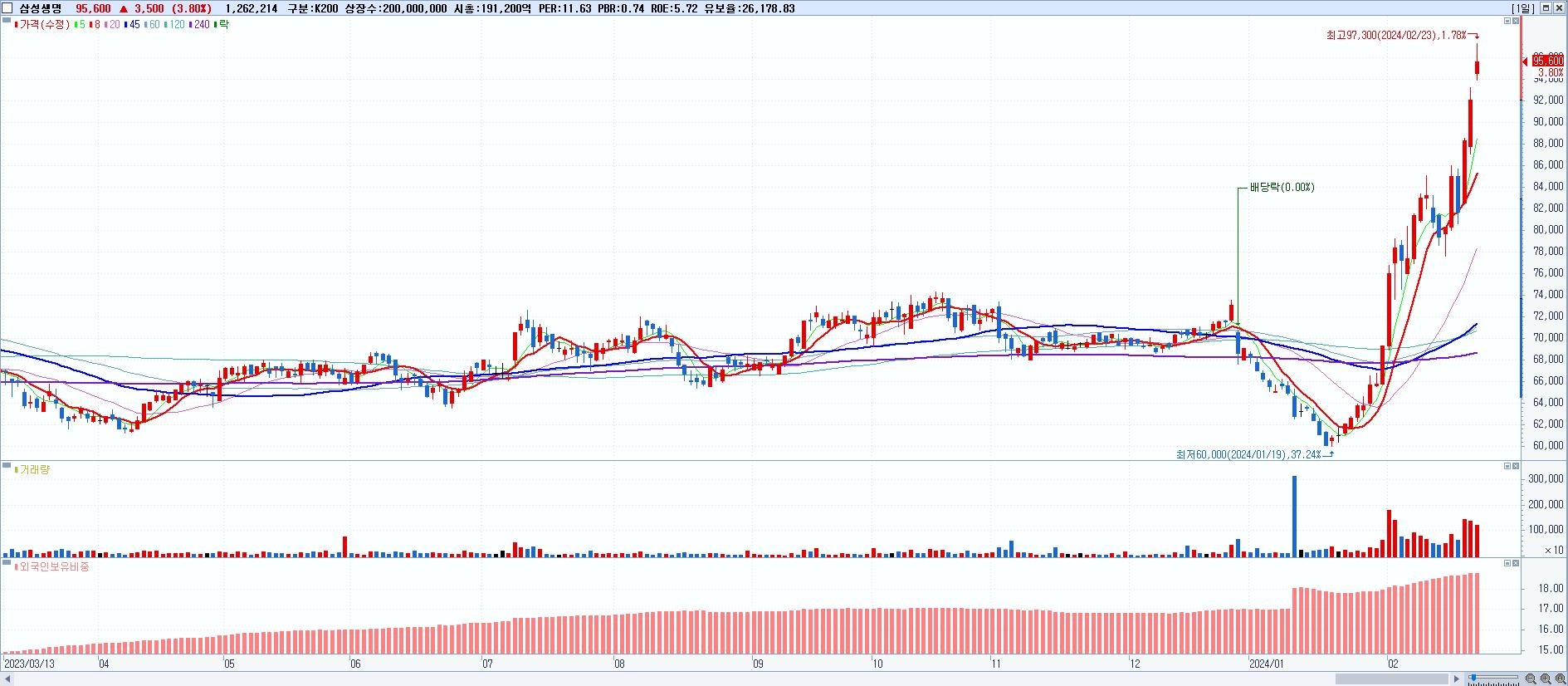 - 삼성생명 (95,600원 ▲ 3.8% , 시총: 191,200억, 거래량: 1,263,950, 거래대금:1,212억, KOSPI)