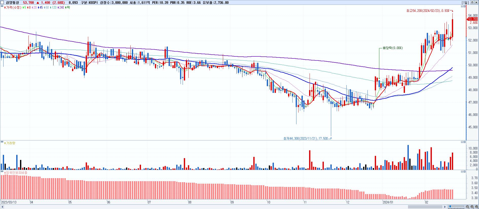 - 삼양통상 (53,700원 ▲ 2.68% , 시총: 1,611억, 거래량: 8,093, 거래대금:4억, KOSPI)