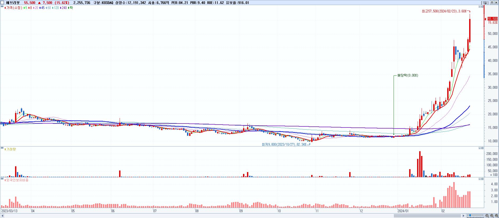 - 에브리봇 (55,500원 ▲ 15.63% , 시총: 6,766억, 거래량: 2,274,865, 거래대금:1,206억, KOSDAQ)