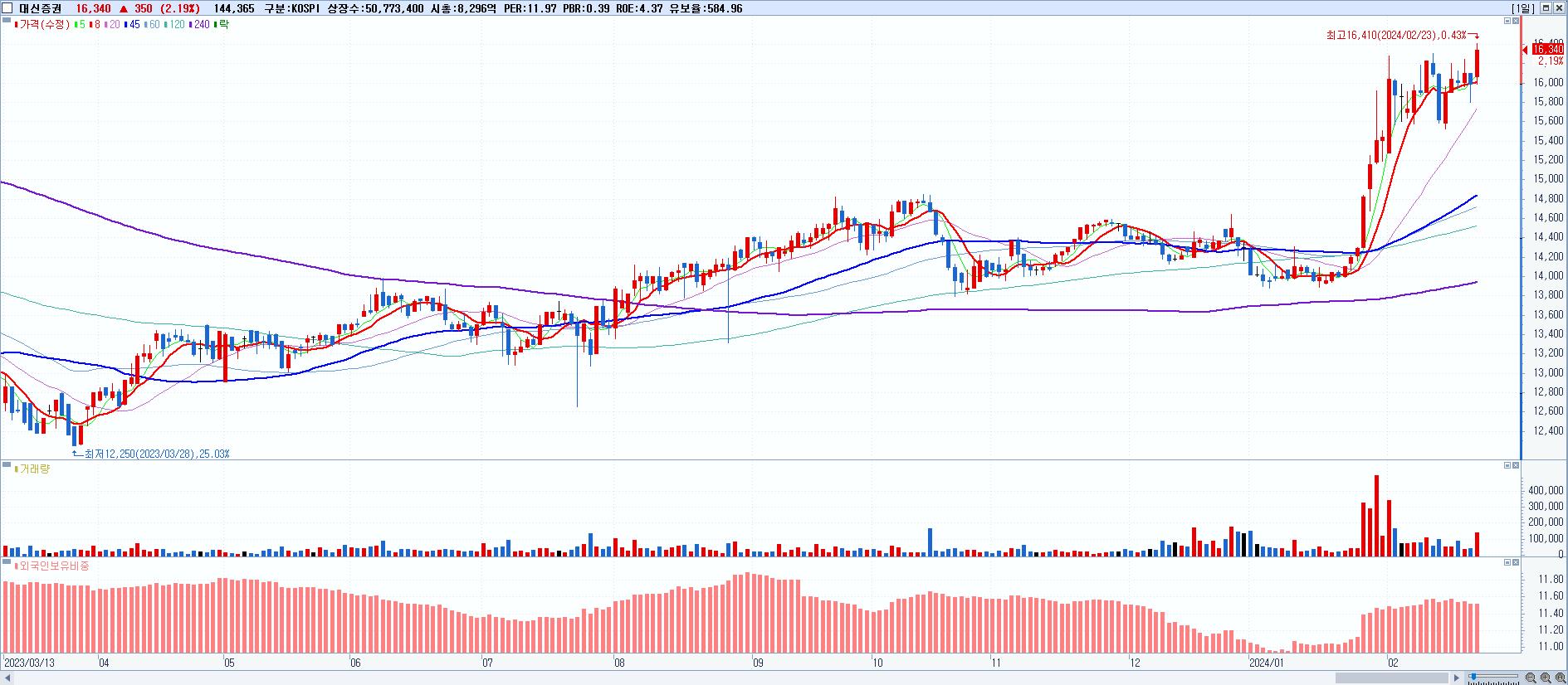 - 대신증권 (16,340원 ▲ 2.19% , 시총: 8,296억, 거래량: 144,416, 거래대금:24억, KOSPI)