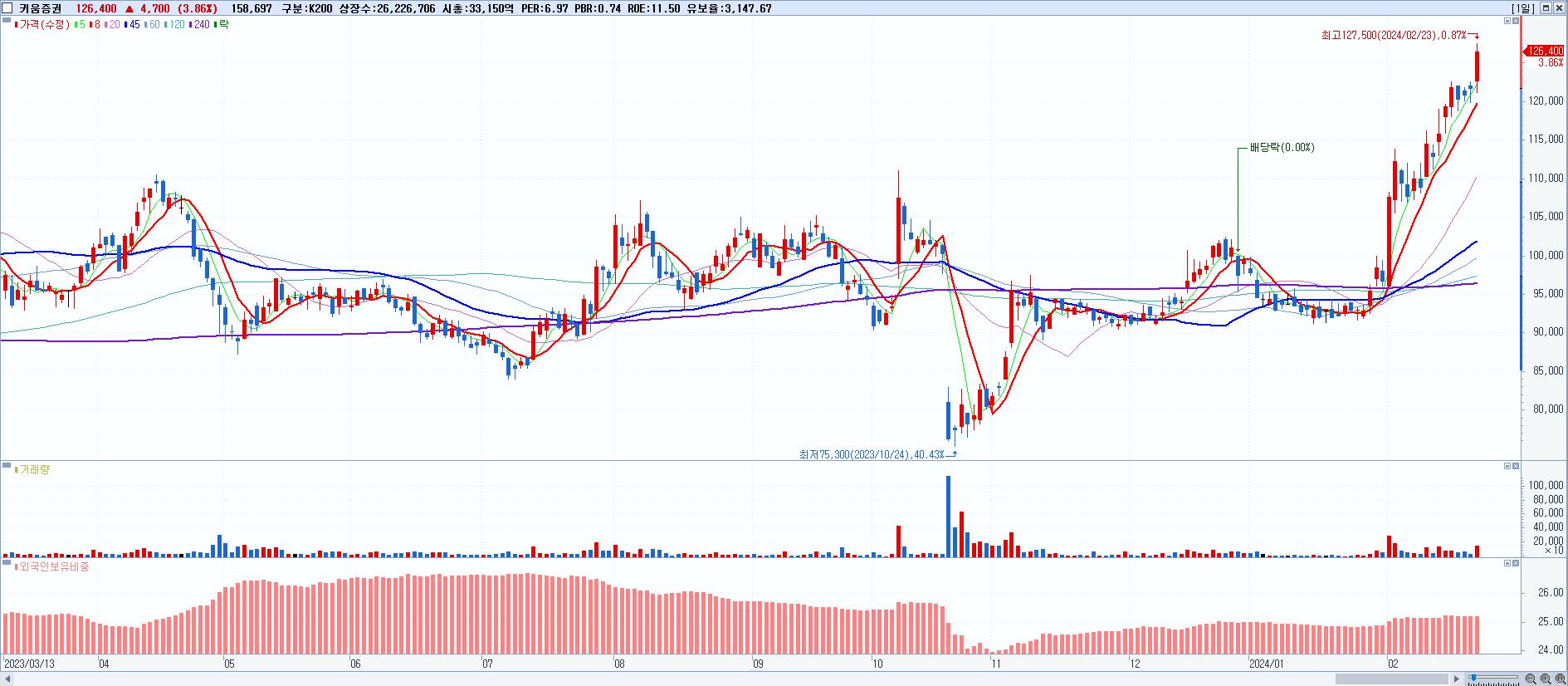- 키움증권 (126,400원 ▲ 3.86% , 시총: 33,151억, 거래량: 158,725, 거래대금:200억, KOSPI)