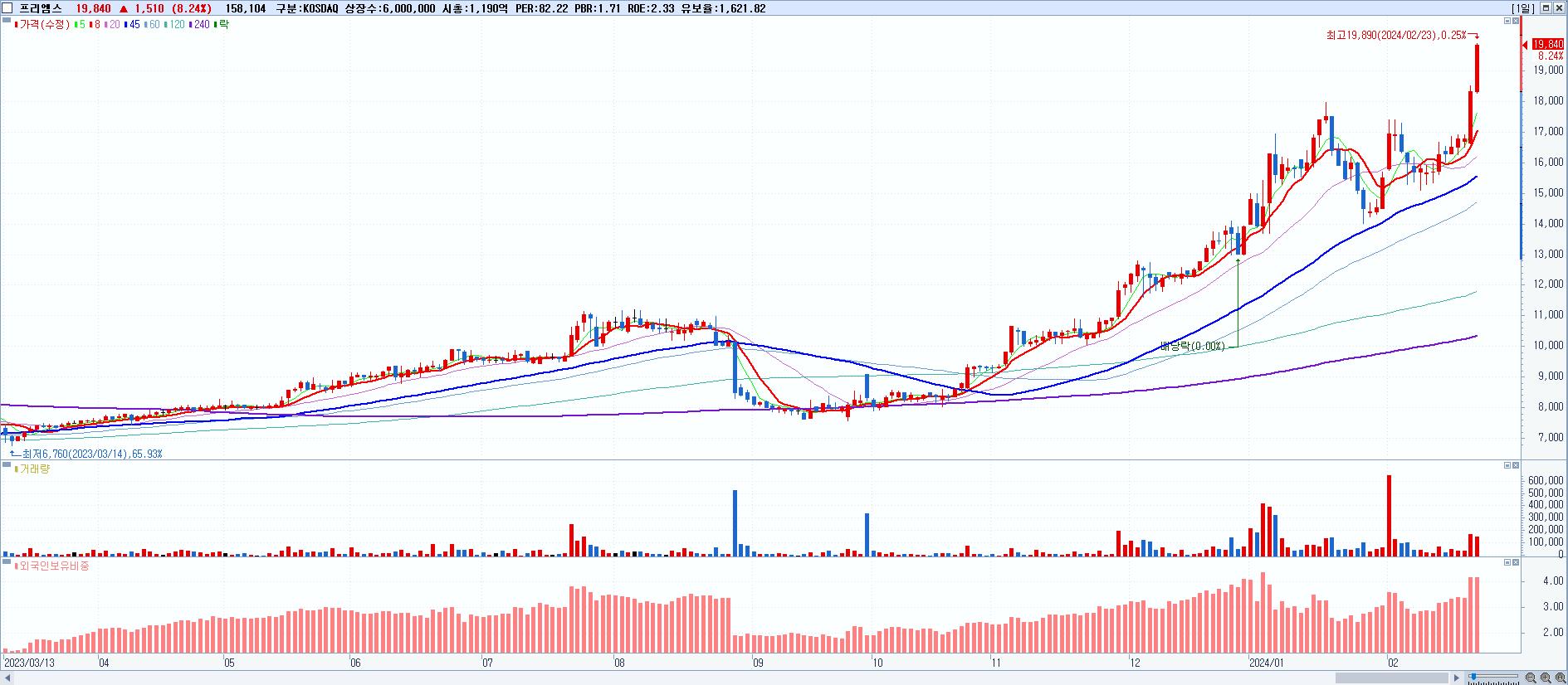 - 프리엠스 (19,840원 ▲ 8.24% , 시총: 1,190억, 거래량: 158,165, 거래대금:30억, KOSDAQ)