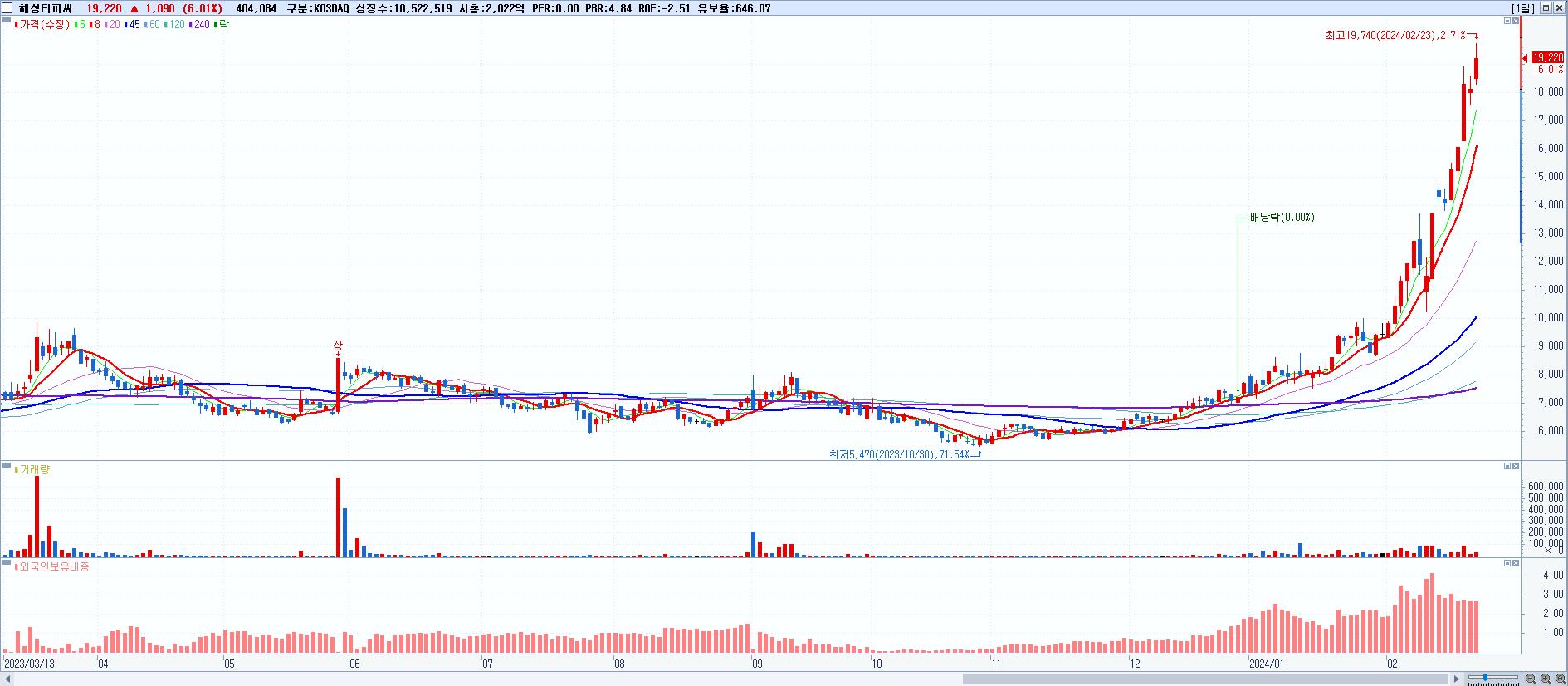 - 해성티피씨 (19,220원 ▲ 6.01% , 시총: 2,022억, 거래량: 406,128, 거래대금:78억, KOSDAQ)