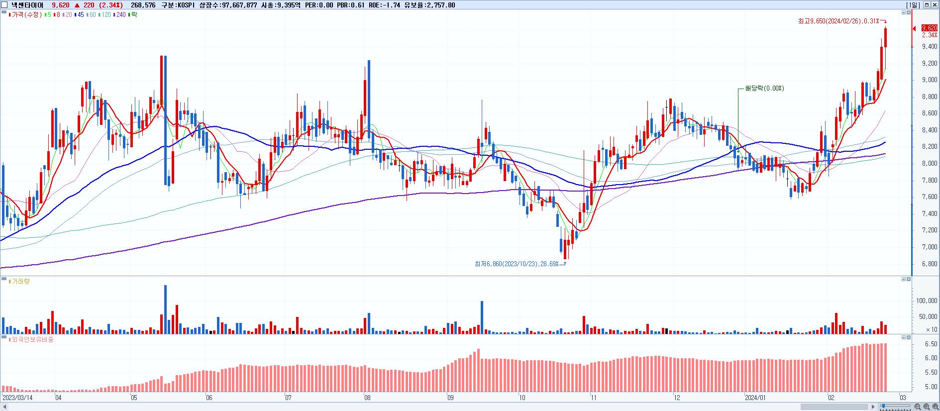 - 넥센타이어 (9,620원 ▲ 2.34% , 시총: 9,396억, 거래량: 268,630, 거래대금:26억, KOSPI)