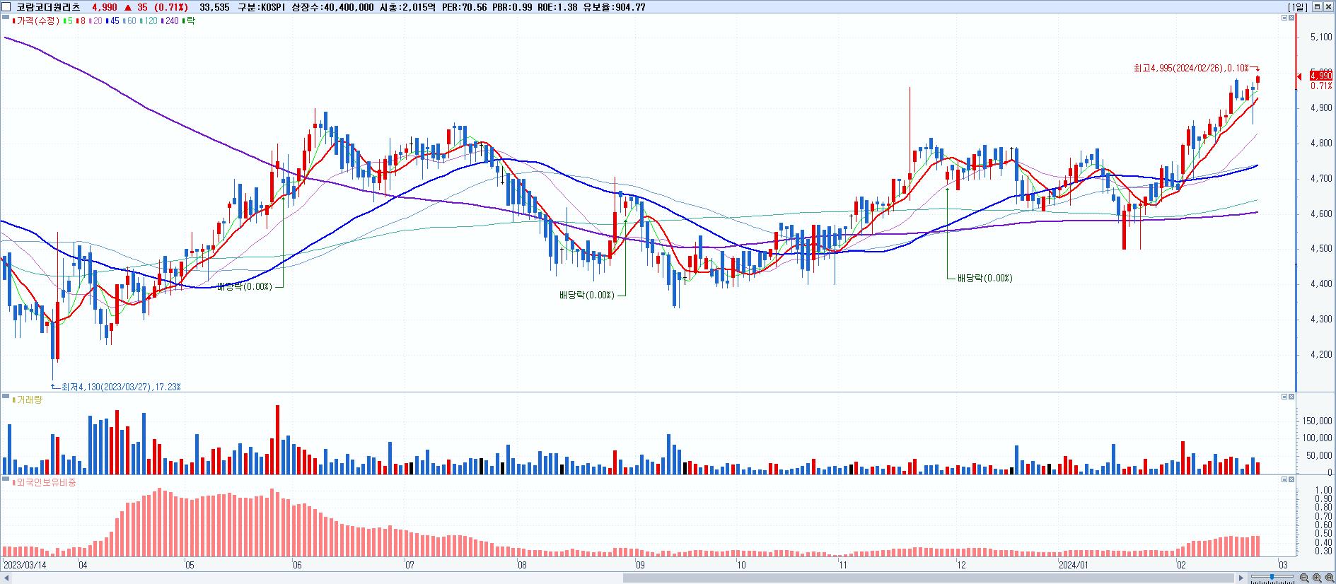 코람코더원리츠 4,990원 ▲ 0.71% (KOSPI, 417310)
