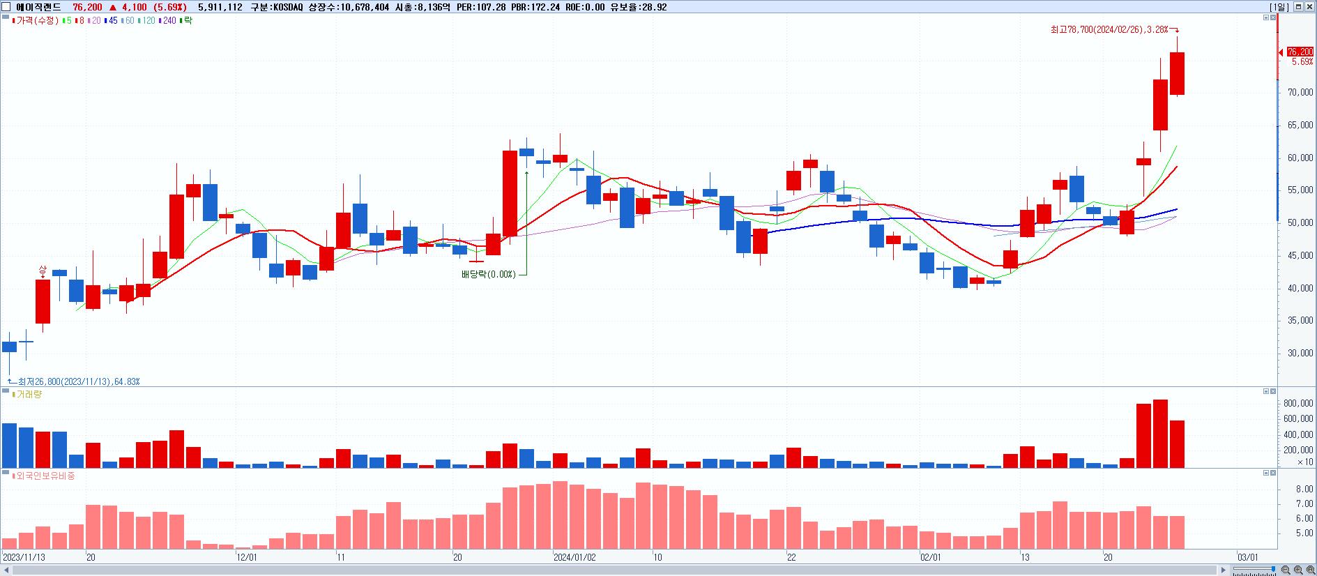 - 에이직랜드 (76,200원 ▲ 5.69% , 시총: 8,137억, 거래량: 5,947,773, 거래대금:4,407억, KOSDAQ)