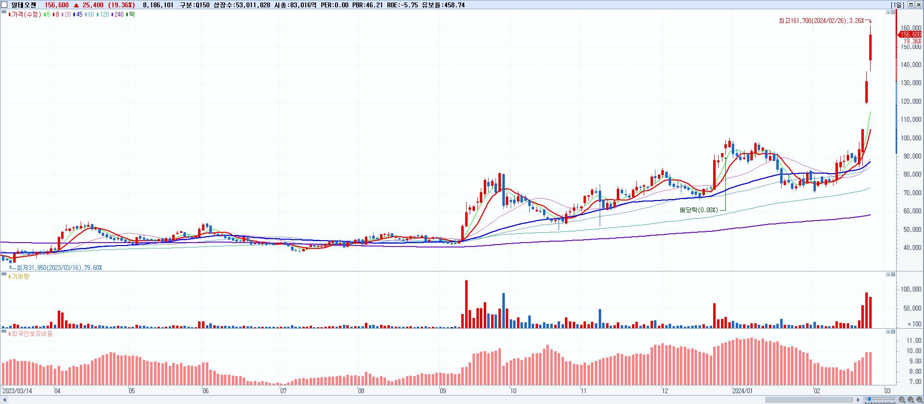 알테오젠 156,600원 ▲ 19.36% (KOSDAQ, 196170)