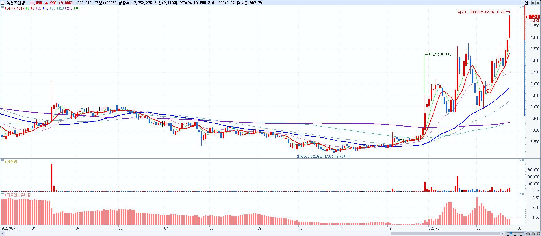 - 녹십자웰빙 (11,890원 ▲ 9.08% , 시총: 2,111억, 거래량: 557,880, 거래대금:65억, KOSDAQ)