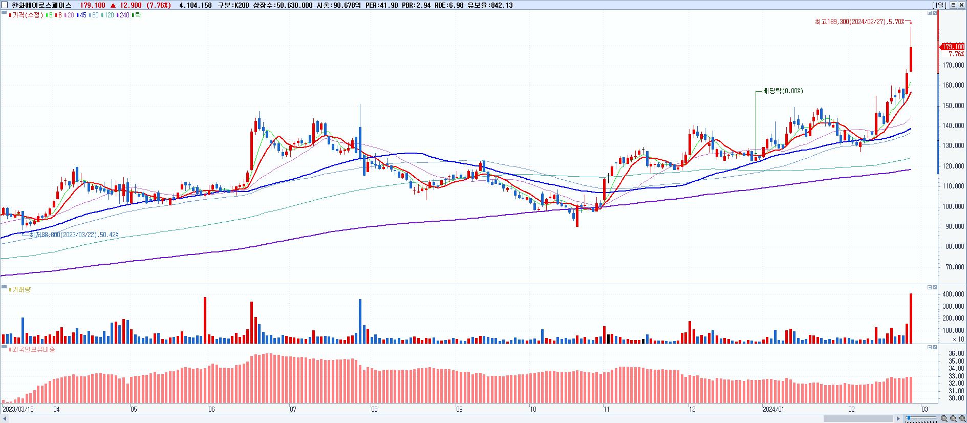 - 한화에어로스페이스 (179,100원 ▲ 7.76% , 시총: 90,678억, 거래량: 4,112,045, 거래대금:7,436억, KOSPI)