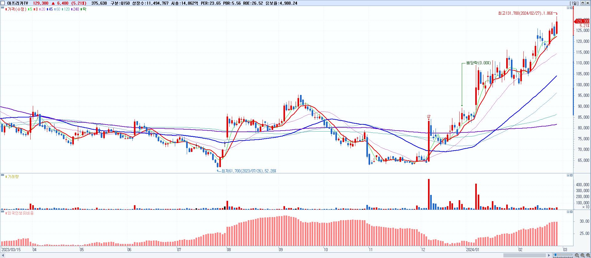 - 아프리카TV (129,300원 ▲ 5.21% , 시총: 14,863억, 거래량: 376,394, 거래대금:483억, KOSDAQ)