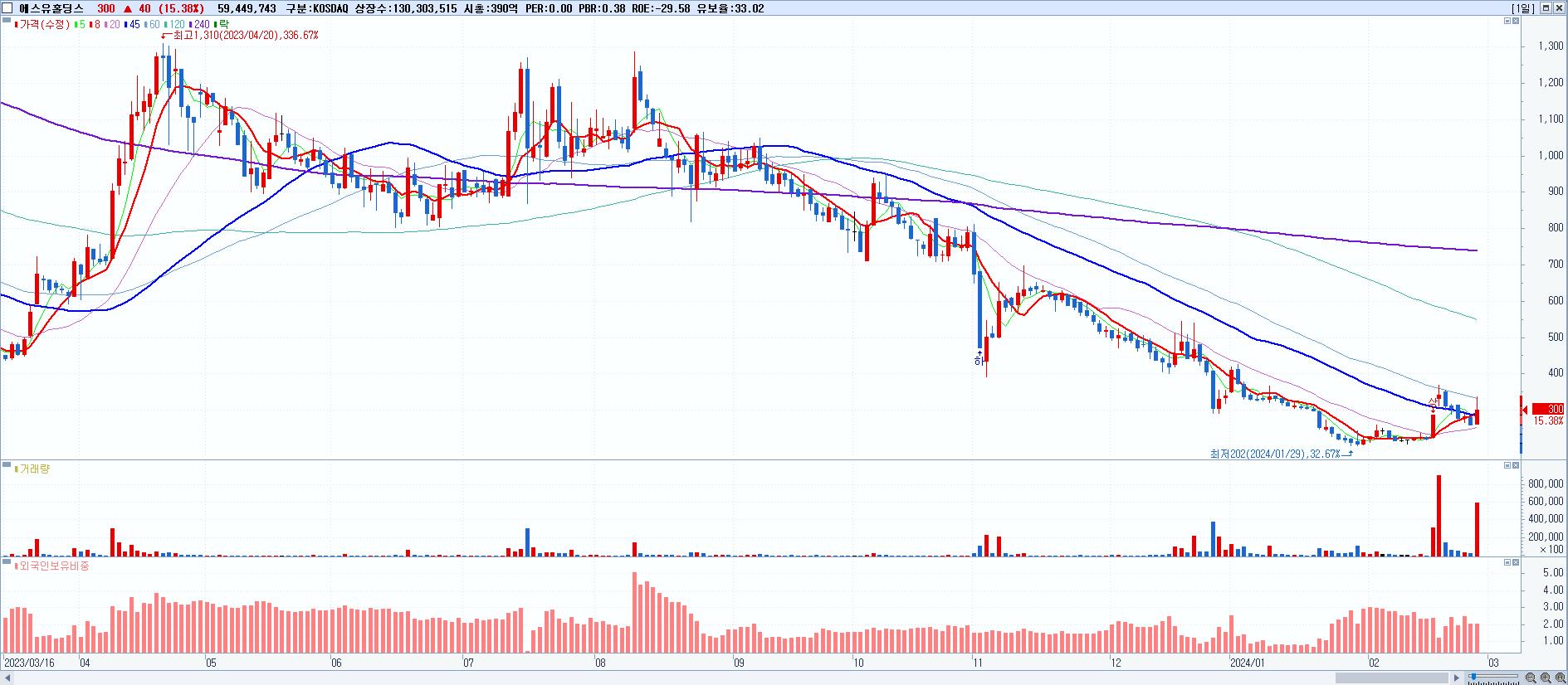- 에스유홀딩스 (300원 ▲ 15.38% , 시총: 391억, 거래량: 59,475,703, 거래대금:187억)