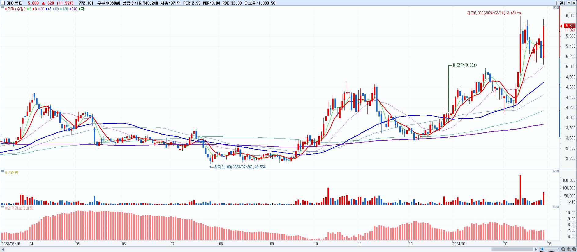- 제이엠티 (5,800원 ▲ 11.97% , 시총: 971억, 거래량: 773,652, 거래대금:43억)