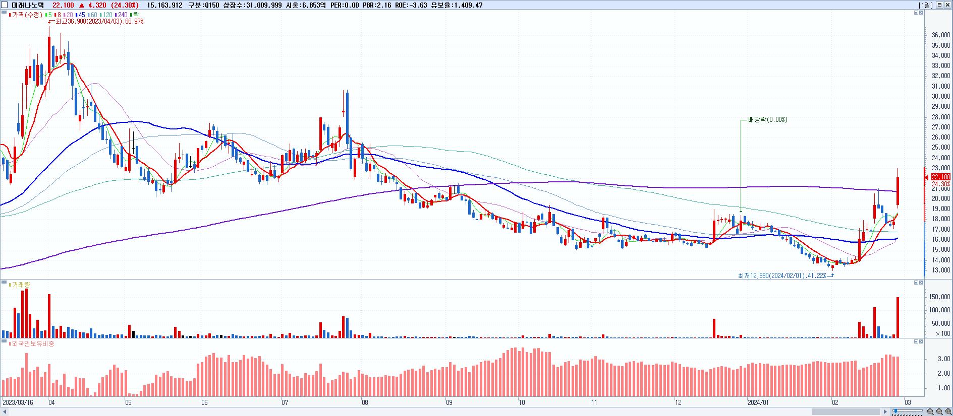 - 미래나노텍 (22,100원 ▲ 24.3% , 시총: 6,853억, 거래량: 15,203,061, 거래대금:3,251억)