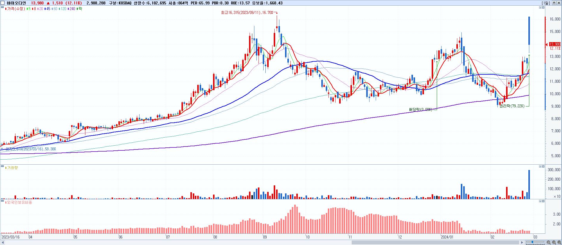 - 바이오다인 (13,980원 ▲ 12.11% , 시총: 864억, 거래량: 3,001,466, 거래대금:470억)