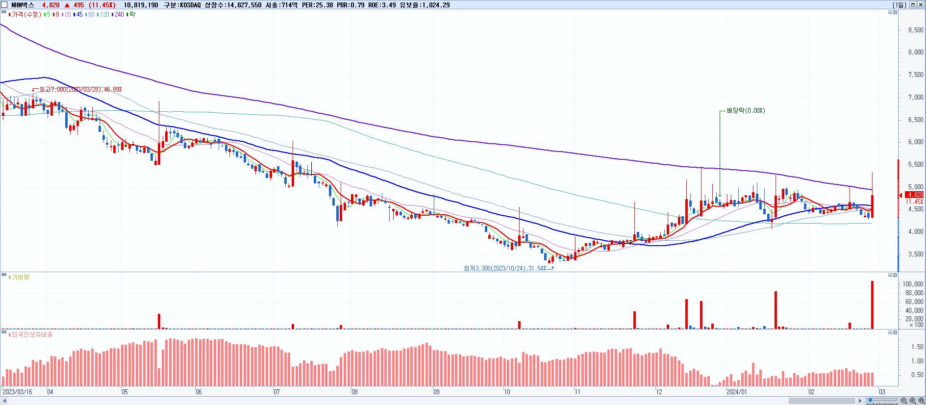 - NHN벅스 (4,820원 ▲ 11.45% , 시총: 715억, 거래량: 10,821,764, 거래대금:547억)