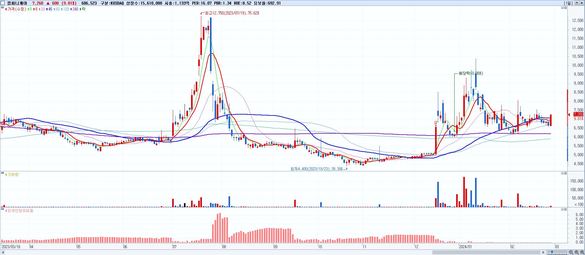 - 컴퍼니케이 (7,260원 ▲ 9.01% , 시총: 1,133억, 거래량: 726,523, 거래대금:52억)