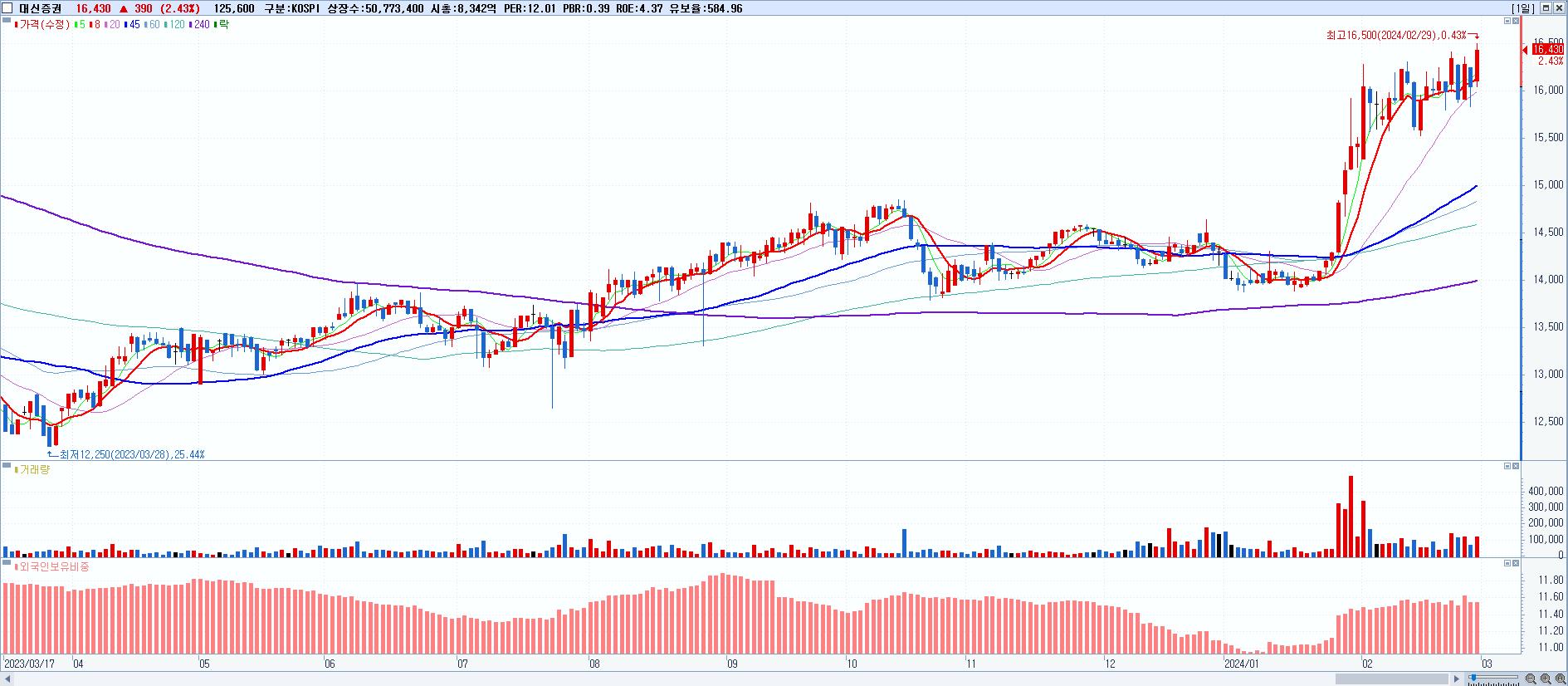 - 대신증권 (16,430원 ▲ 2.43% , 시총: 8,342억, 거래량: 134,524, 거래대금:22억, KOSPI)