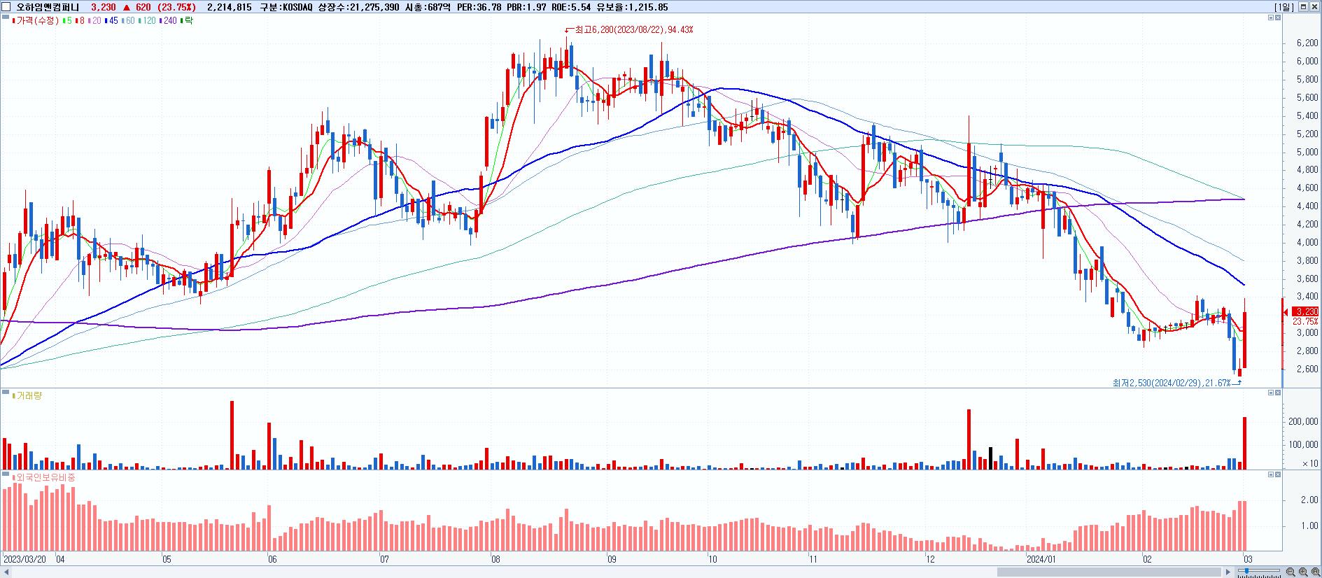 - 오하임앤컴퍼니 (3,230원 ▲ 23.75% , 시총: 687억, 거래량: 2,214,970, 거래대금:70억)