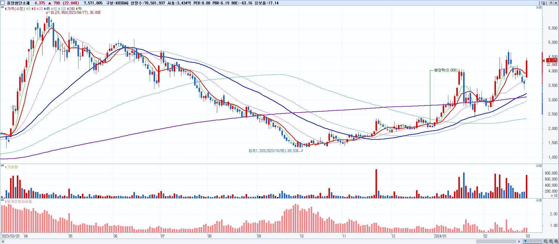 - 중앙첨단소재 (4,375원 ▲ 22.04% , 시총: 3,434억, 거래량: 7,571,675, 거래대금:320억)