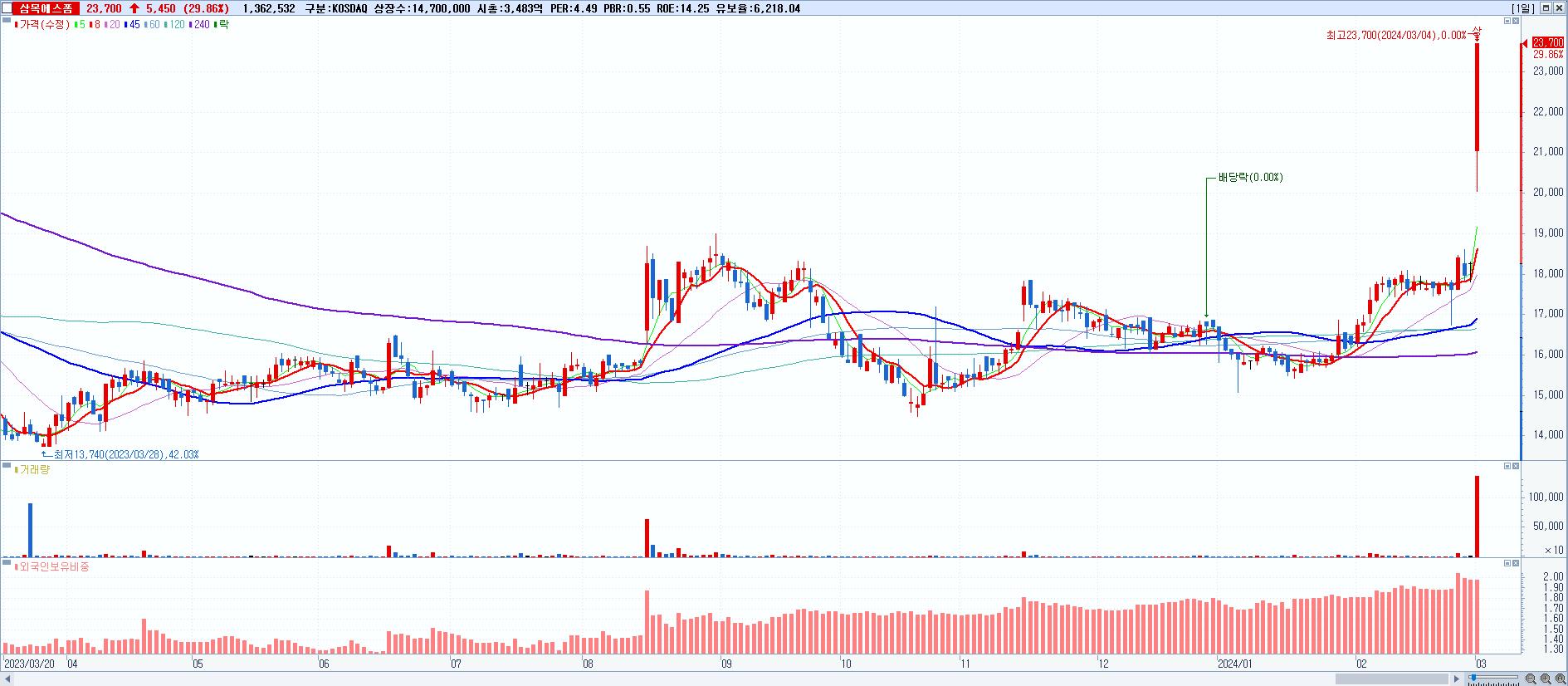 - 삼목에스폼 (23,700원 ▲ 29.86% , 시총: 3,484억, 거래량: 1,362,707, 거래대금:309억)