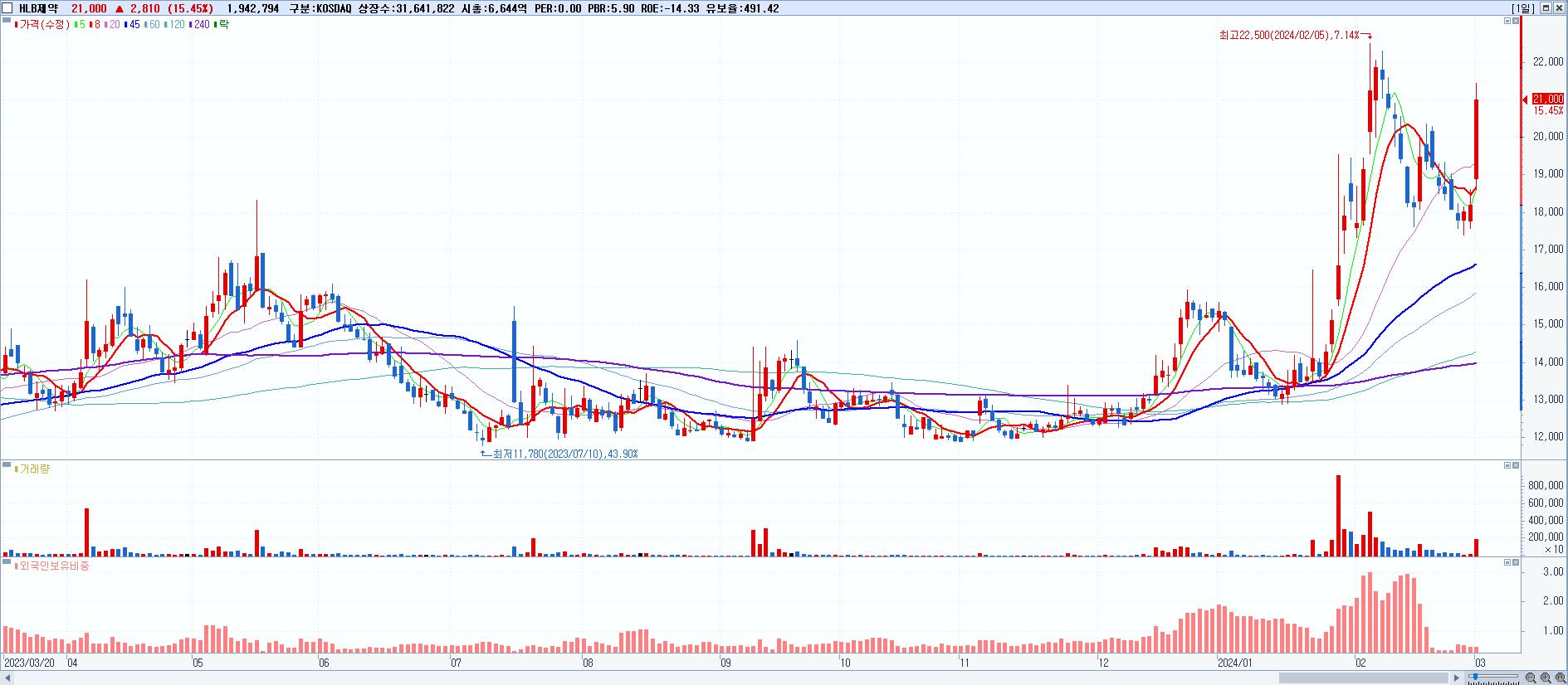 - HLB제약 (21,000원 ▲ 15.45% , 시총: 6,645억, 거래량: 1,943,180, 거래대금:399억)