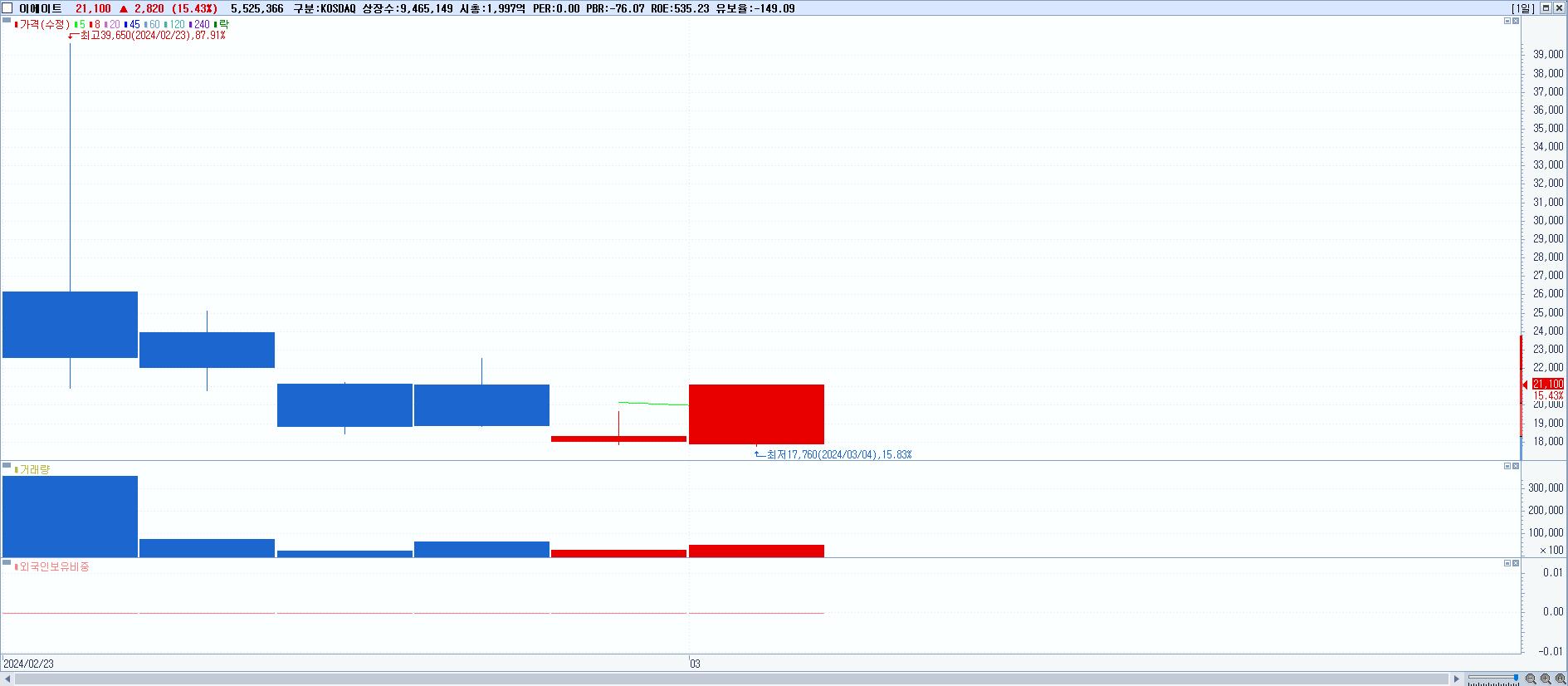 - 이에이트 (21,100원 ▲ 15.43% , 시총: 1,997억, 거래량: 5,656,479, 거래대금:1,090억)