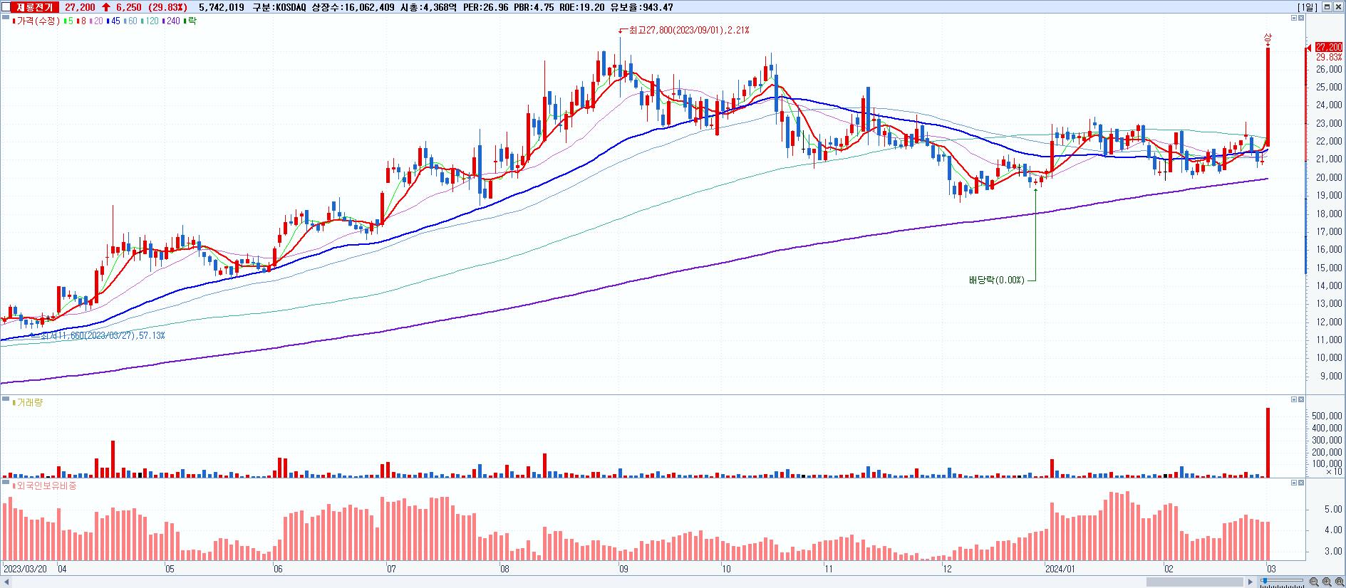- 제룡전기 (27,200원 ▲ 29.83% , 시총: 4,369억, 거래량: 5,743,001, 거래대금:1,492억)