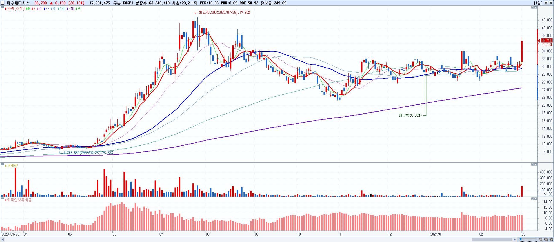 - 이수페타시스 (36,700원 ▲ 20.13% , 시총: 23,211억, 거래량: 17,354,639, 거래대금:5,997억)