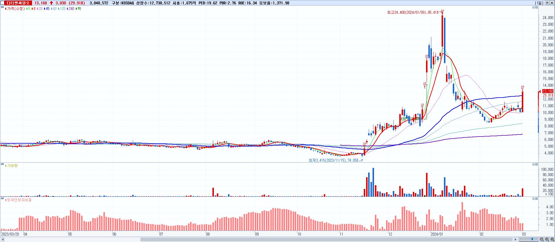 - 디티앤씨알오 (13,160원 ▲ 29.91% , 시총: 1,675억, 거래량: 3,041,403, 거래대금:368억)