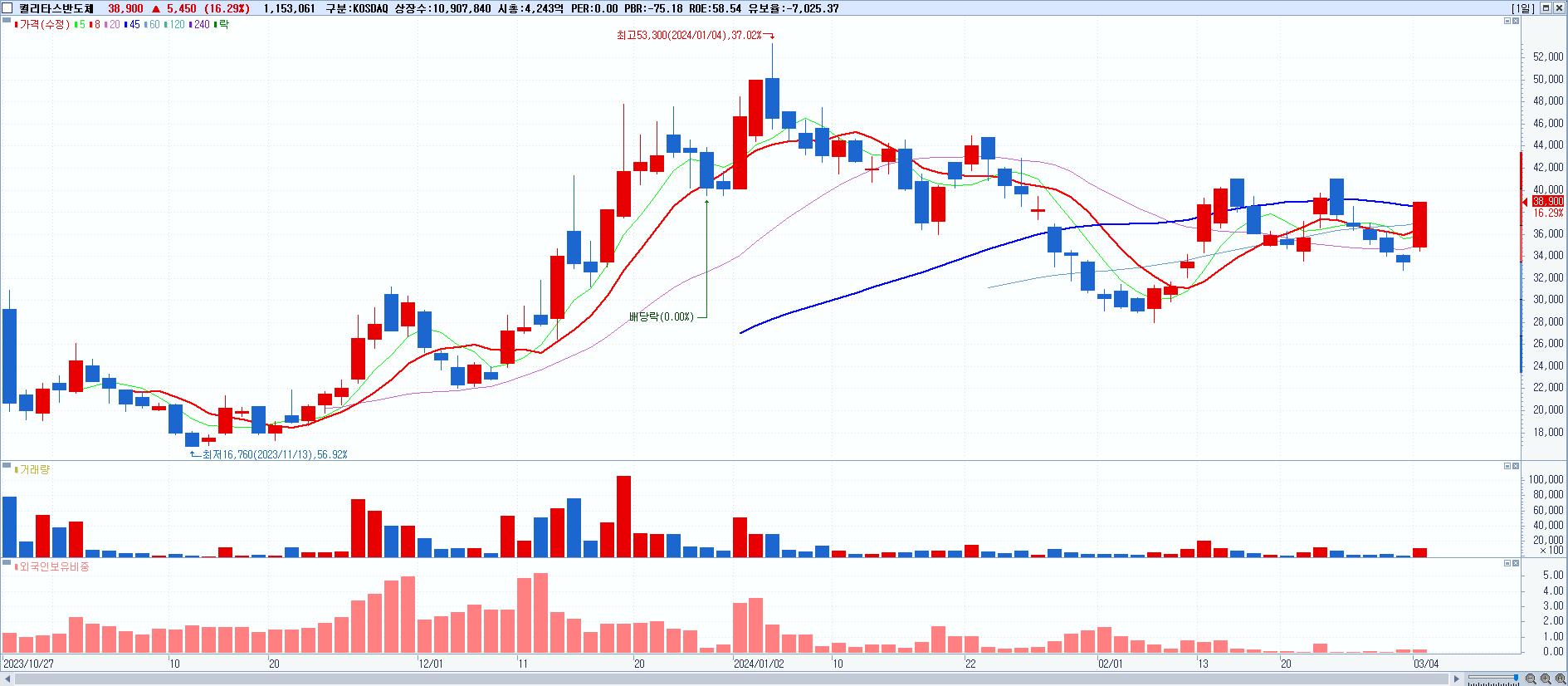 - 퀄리타스반도체 (38,900원 ▲ 16.29% , 시총: 4,243억, 거래량: 1,154,353, 거래대금:432억)