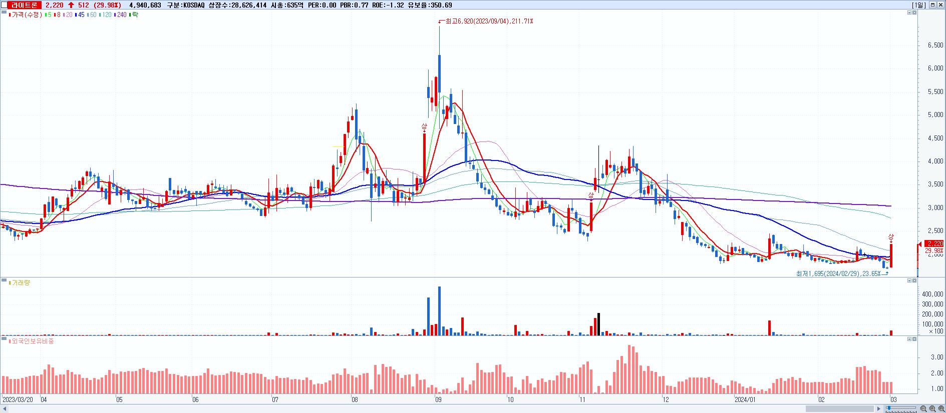 - 라이트론 (2,220원 ▲ 29.98% , 시총: 636억, 거래량: 4,941,062, 거래대금:102억)