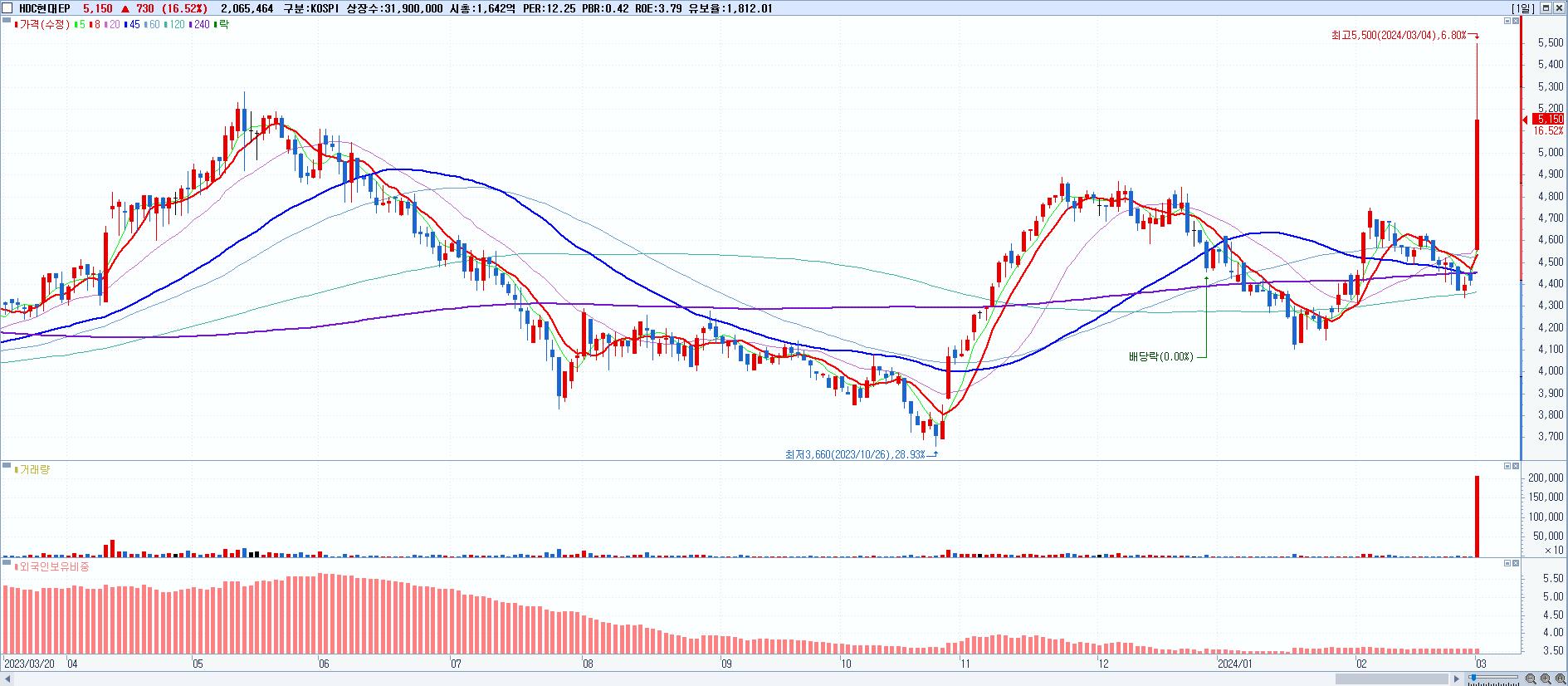 - HDC현대EP (5,150원 ▲ 16.52% , 시총: 1,643억, 거래량: 2,066,043, 거래대금:105억)