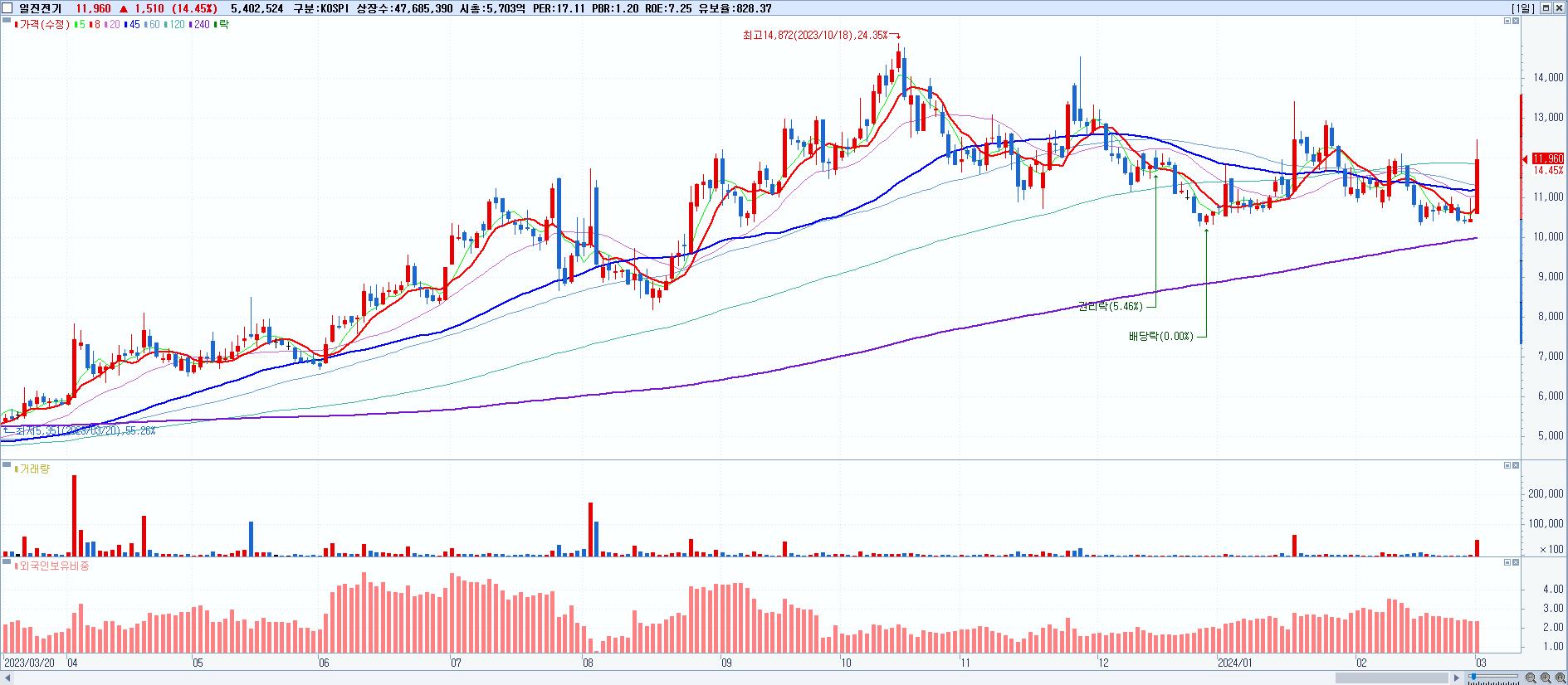 28.일진전기 11,960원 ▲ 14.45% (KOSPI, 103590)